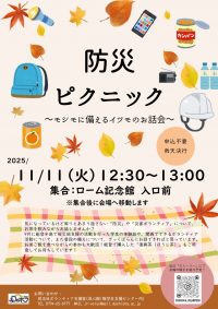 202511.11(火) 防災ピクニック~モシモに備えるイツモのお話会~ 11.11(火) 気になっているけど周りとあまり話さない「防災」や「災害ボランティア」について、お茶を飲みながらお話しませ.... 交流カフェ
